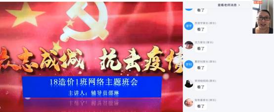 为了加强学生对疫情的认识,做好大学生的心理疏导、提高防范意,班主任(辅导员)老师也运用线上教学平台给学生开主题班会,共同战“疫”,进行爱国教育、弘扬正能量、表达关心、传递温暖。在疫情期的这种新的授课方式,师生积极参与、精神饱满、课堂气氛积极活跃。