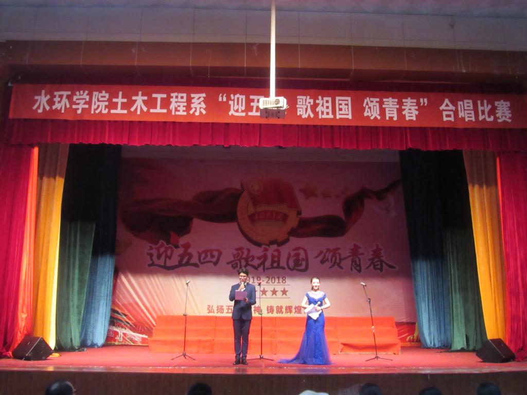 2018年4月19日晚上七点,河南水利与环境职业学院土木工程系在大礼堂举办以“迎五四,歌祖国,颂青春”为主题的合唱比赛。系全体学管老师、辅导员出席此次活动。