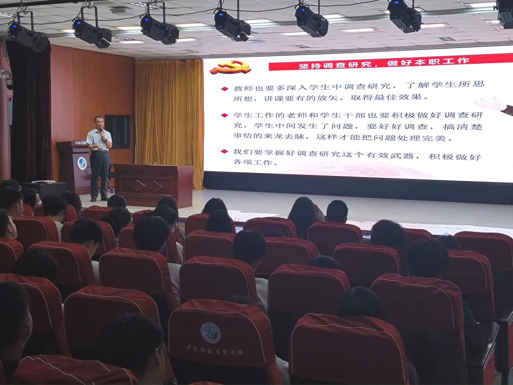 文琳从“在全党大兴调查研究的重大意义”、“把握调查研究总体要求”、“学习调查研究方法”三个方面,对习近平总书记关于调查研究的重要论述进行了深入阐释,强调教师要多深入学生,做好调查研究,了解学生所思所想;学生干部要学会调查研究,提高解决实际问题的能力。