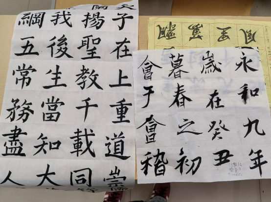 参加活动的同学们准备宣纸、毛笔、墨水等书写工具,在规定时间内拟定书写内容进行现场创作。同学们全神贯注,书写刚劲有力,线条流畅自然,《春晓》、《兰亭集序》、《沁园春·雪》等一幅幅作品展现出较高的书法水平。