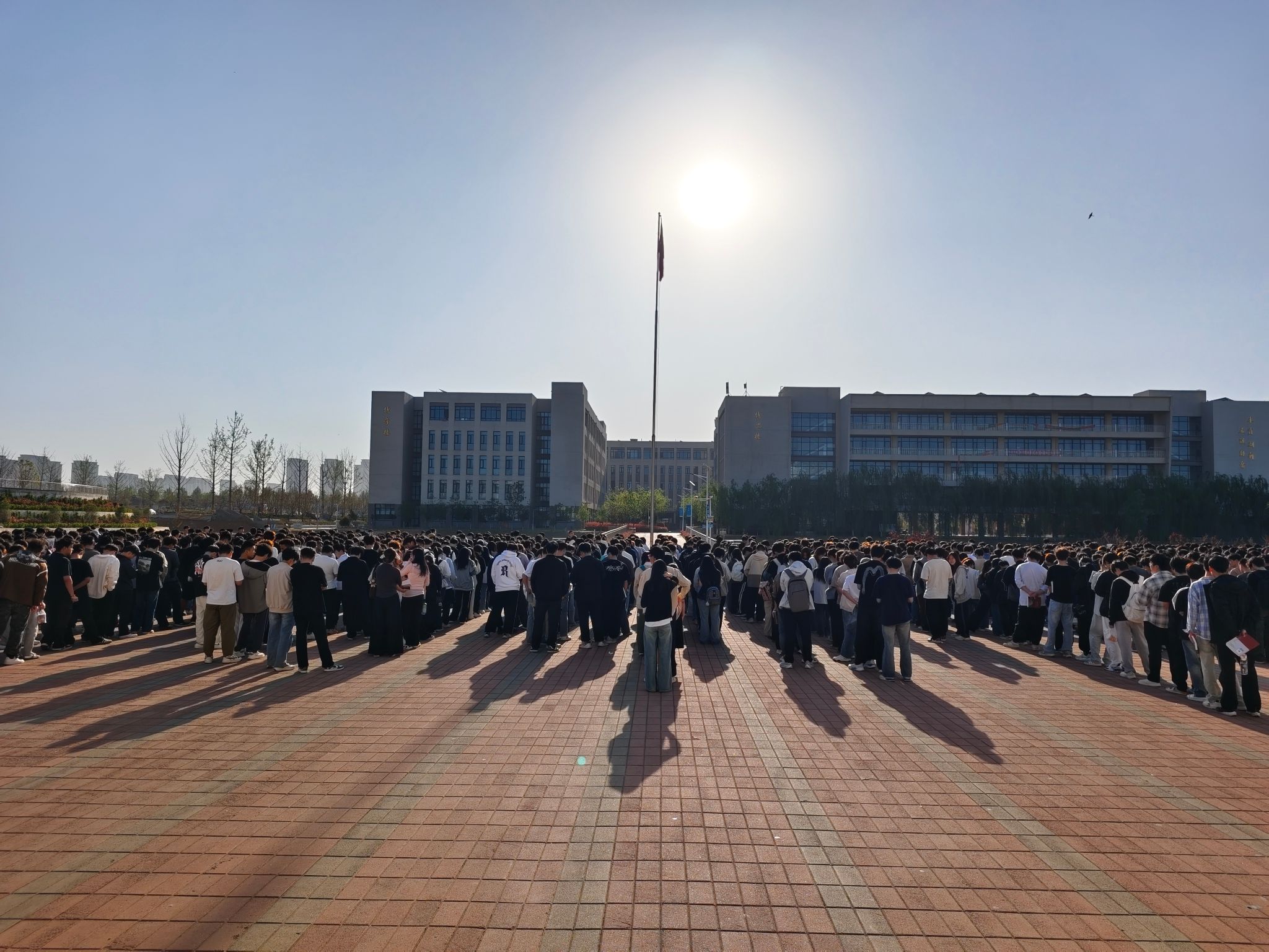 早上7:30升旗仪式正式开始。国旗护卫队迈着坚定的步伐走向升旗台,鲜艳的五星红旗伴随着《义勇军进行曲》冉冉升起。全体师生肃穆而立,向国旗行注目礼。