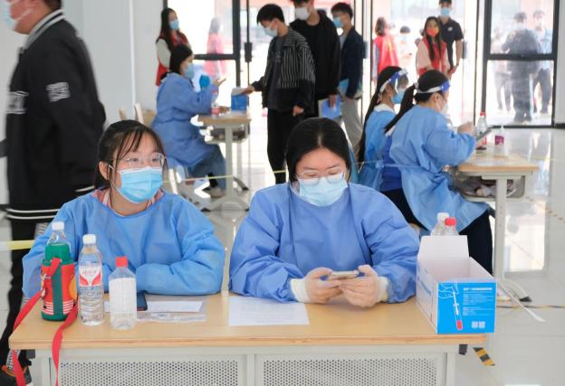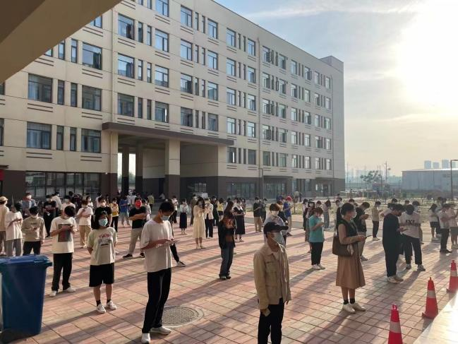 师生齐上阵,辅助医护人员,做好校园核酸检测志愿者服务。“一米间隔线”等防疫标识清晰、防护措施规范,排队秩序井然。