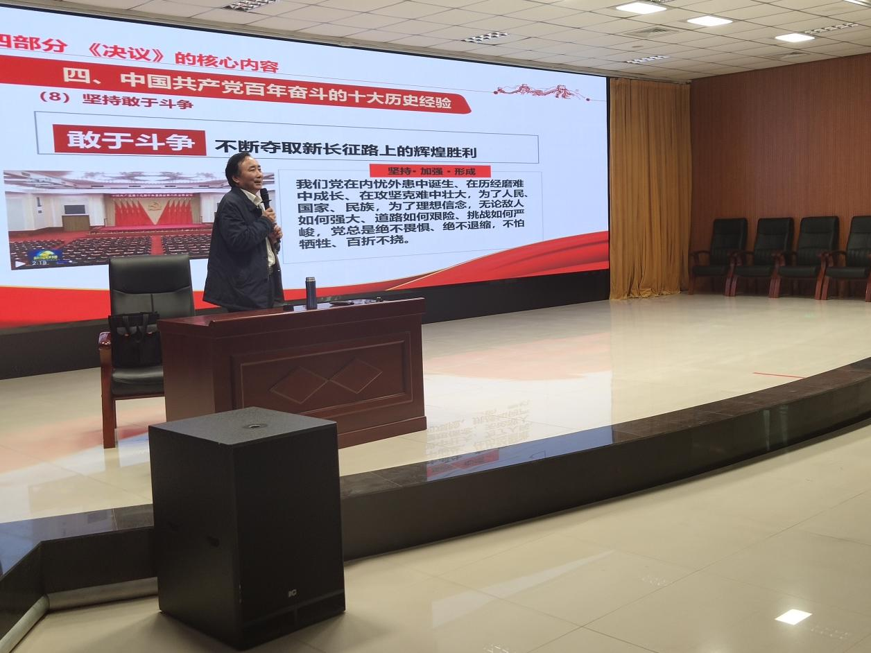 黄功学重点围绕《中共中央关于党的百年奋斗重大成就和历史经验的决议》的整体框架、出台背景、出台重大意义、核心内容四个方面进行讲解。他指出,社会主义革命是开天辟地的事业,总结经验,吸取教训,伟大的中国梦就一定能够实现。他鼓励同学们认真学习党的历史经验教训,一时的成功不要骄傲自满,一时的错误不要垂头丧气,要树立自力更生、独立自主的决心,为祖国的繁荣昌盛贡献一份力量。