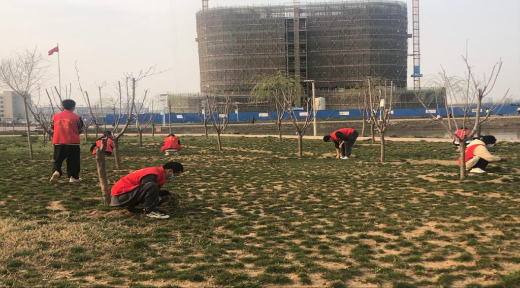 参加活动的志愿者共分为3个小组,对操场附近的卫生进行清理。