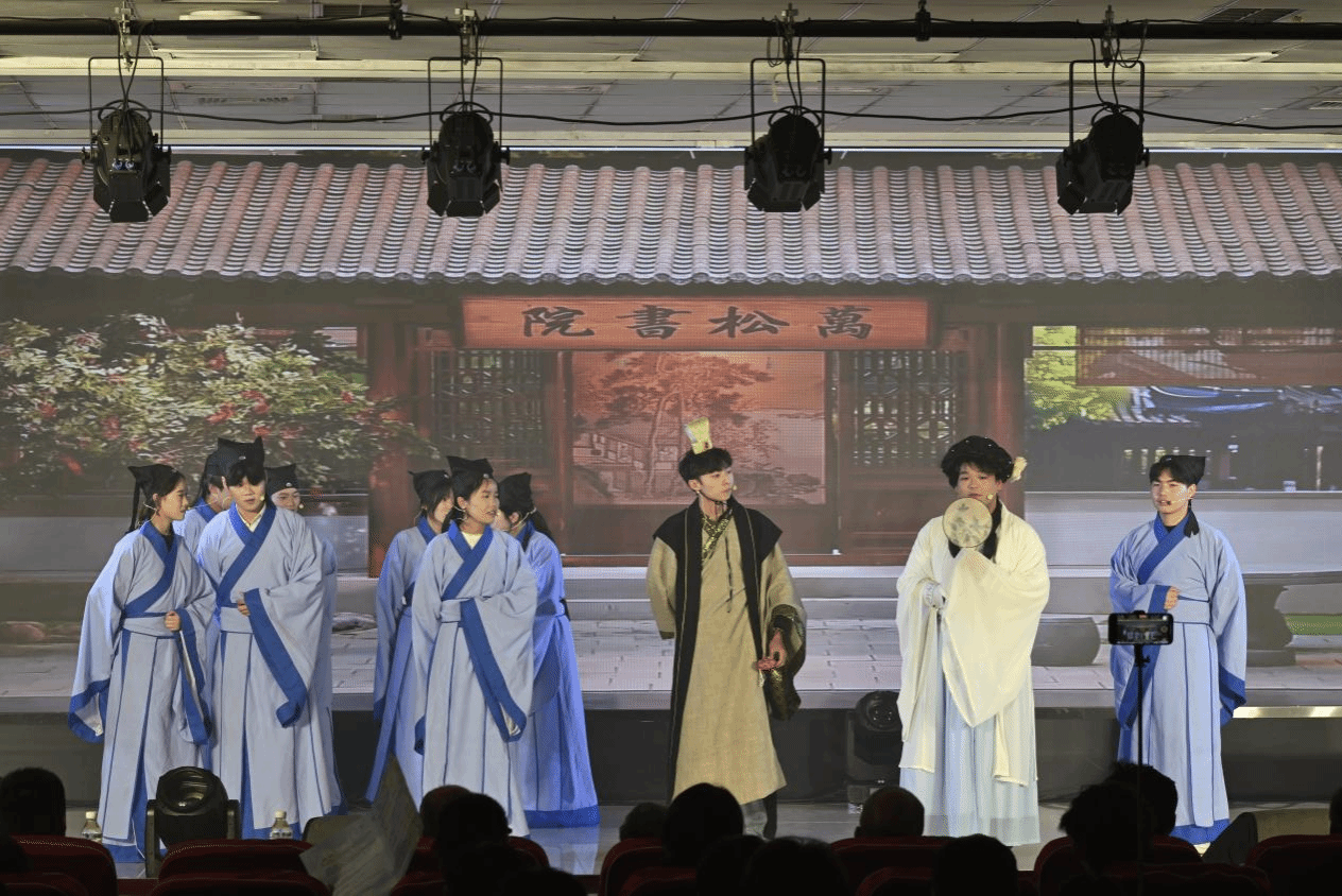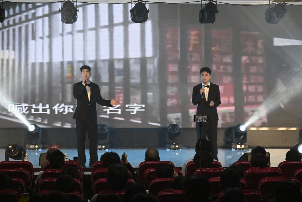语言与戏曲节目同样亮点频出。豫剧《京都风云》中,学生扮演“净”角,唱腔如黄钟大吕,展现了传统戏曲艺术魅力,引得满堂喝彩;朗诵《觉醒年代》以革命先烈的赤诚丹心为魂,借学子深情演绎,传递穿越百年的家国情怀,展示了当代青年对红色基因的传承;配音与小品节目也在晚会中展现了同学们的想象力和青春创意,小品《万松书院》以温情为底色,通过幽默剧情展现深厚的师生情谊。现场掌声不断,气氛热烈。