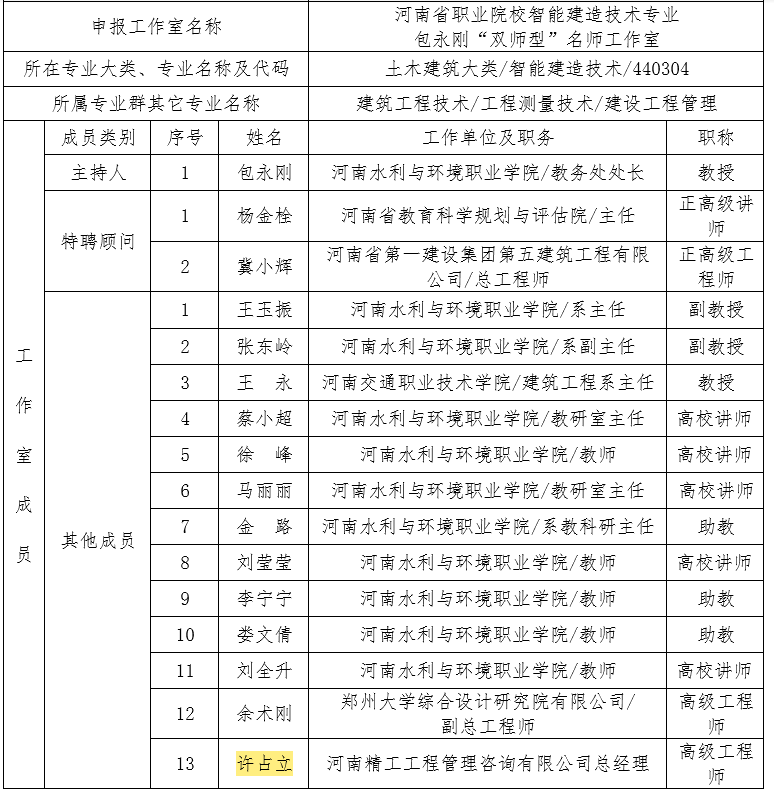 2023年五月,许占立技术技能大师工作室联合申报河南省职业院校“双师型”名师工作室。