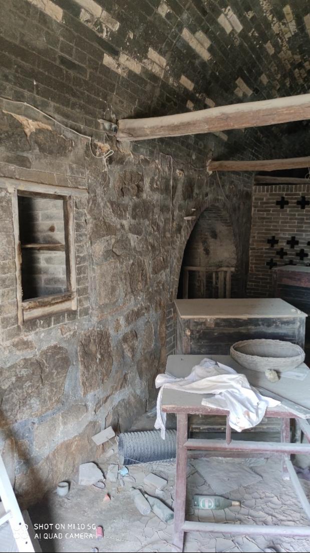 落面阔狭窄,为典型的以靠崖窑为正房,南北瓦房为厢房的窑房院式院落。正房位置的两层靠崖窑首层开挖三孔窑洞,二层仅开挖一孔体量较小的窑洞,二层窑洞前留有平台形成二层庭院空间,靠崖窑均以砖石砌筑窑脸。南北厢房为单坡瓦房,进深尺寸较小,均为三开间,南厢房与第一进院落南厢房紧密连接,北厢房与主窑间隔空间的北侧土崖还开有一孔窑洞。窑洞共5孔,均为一层单孔窑,前檐墙体用毛石及青砖砌筑,门窗、壁龛处用青砖砌筑砖券,窑洞内部用青砖砌筑加固土墙。