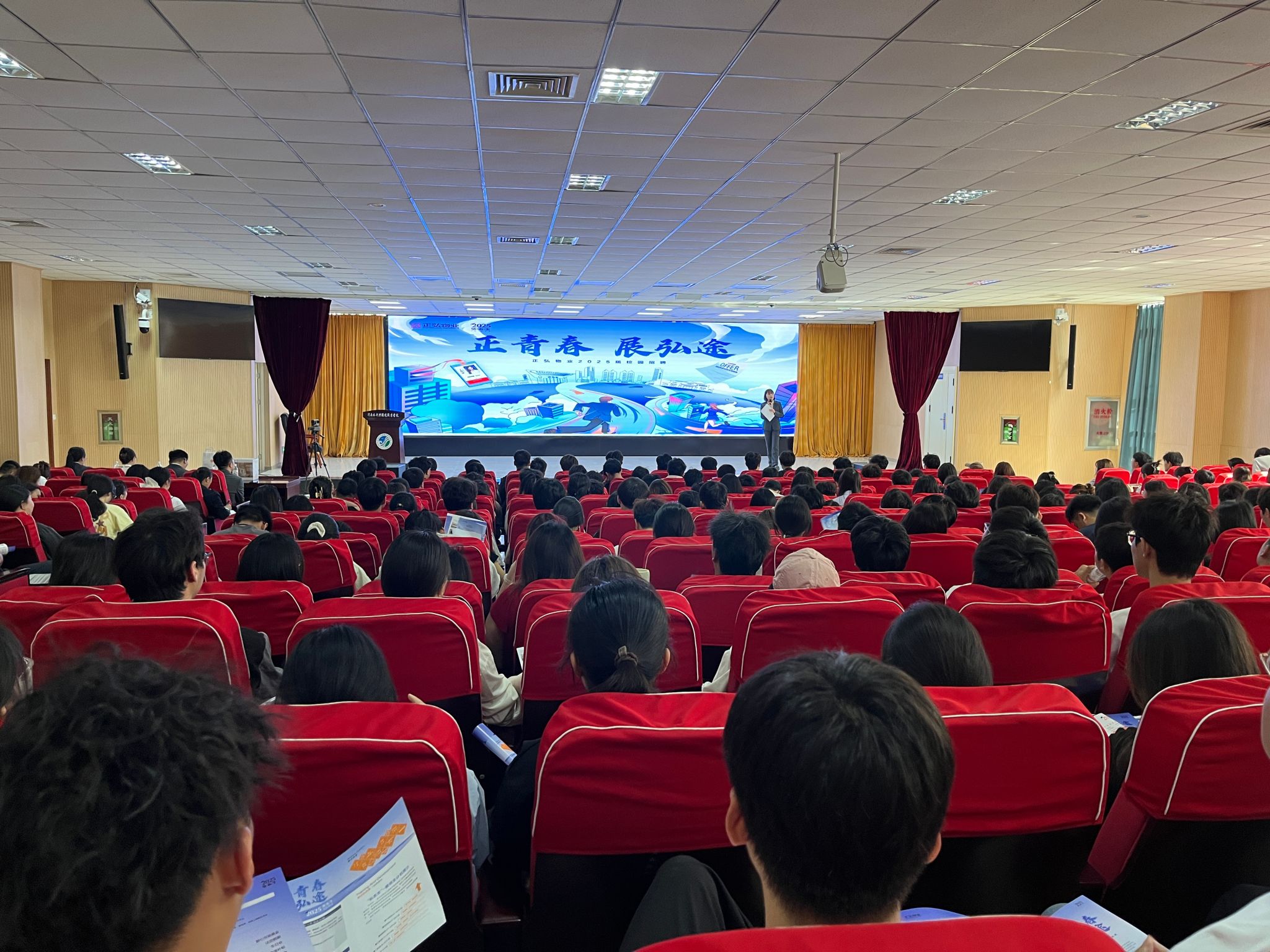 宣讲会上,正弘物业人事专员通过企业宣传片、PPT展示等方式,全面介绍了公司的发展概况、行业优势及人才培养体系,重点解读了“弘志生”管培生计划。此外,还针对本次招聘的工程管理(土木方向)、客服前台等岗位的职责要求、薪资福利及晋升通道作了详细说明。